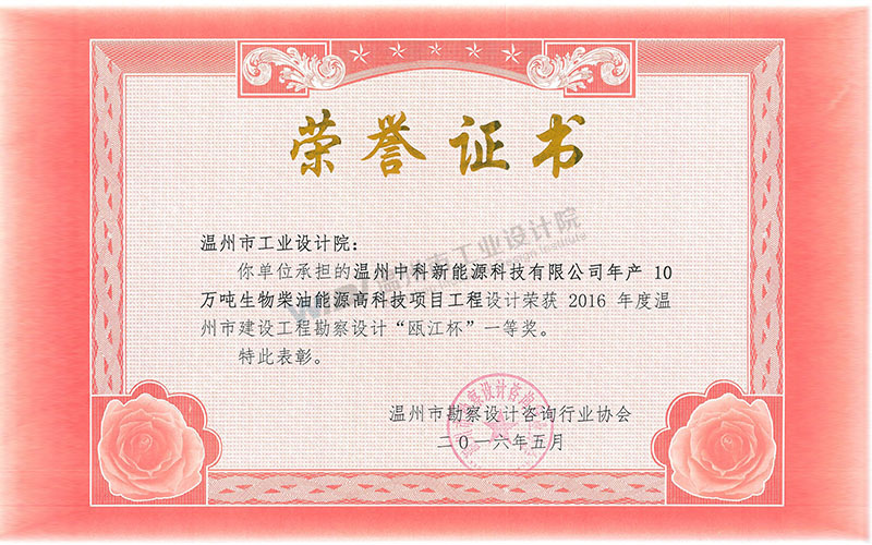 溫州中科新能源科技有限公司年產(chǎn)10萬噸生物柴油能源高科技項(xiàng)目 甌江杯一等獎(jiǎng)