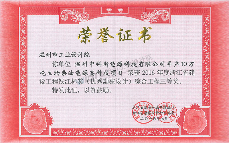 溫州中科新能源科技有限公司年產(chǎn)10萬噸生物柴油能源高科技項(xiàng)目 錢江杯 綜合工程三等獎(jiǎng)